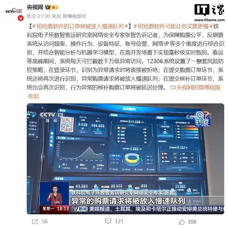 据央视网 2 月 2 日报道,铁科院电子所数智客运研究室网络安全专家张智表示,为保障购票公平,反刷票系统从访问频率、操作行为、设备特征、账号信誉、网络 IP 等多个维度进行综合识别,并结合智能分析与机器学习模型,在高并发场景下实现毫秒级实时甄别。春运等高峰期间,系统每天可拦截数千万级异常访问。