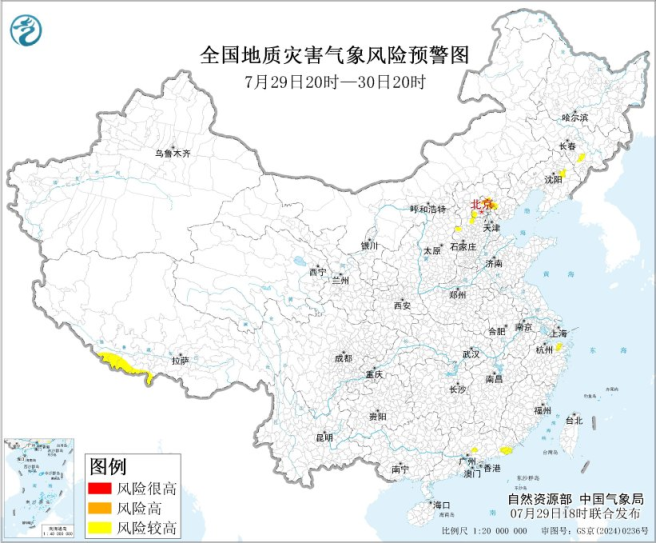 预计,7月29日20时至30日20时,北京北部和西南部、天津北部、河北西部、中部和北部、辽宁东部、吉林南部、浙江东部、广东中部和东部、西藏南部发生地质灾害的气象风险较高(黄色预警);北京北部、天津北部、河北东北部发生地质灾害的气象风险高(橙色预警)。各级政府及有关部门按照应急预案做好地质灾害防御工作。请社会公众及时关注地质灾害气象风险预警信息,谨慎前往地质灾害预警区域。橙色预警区内高风险隐患点和风险区受威胁人员请根据当地防灾部门组织立即撤离前往附近避险安置点,临坡临崖临沟临水人员根据撤离信号及时撤离前往附近避险安置点;黄色预警区内人员,请随时关注预警信息变化,注意附近警示标志,避免在沟谷、斜坡、陡崖(坎)等高风险地带逗留。