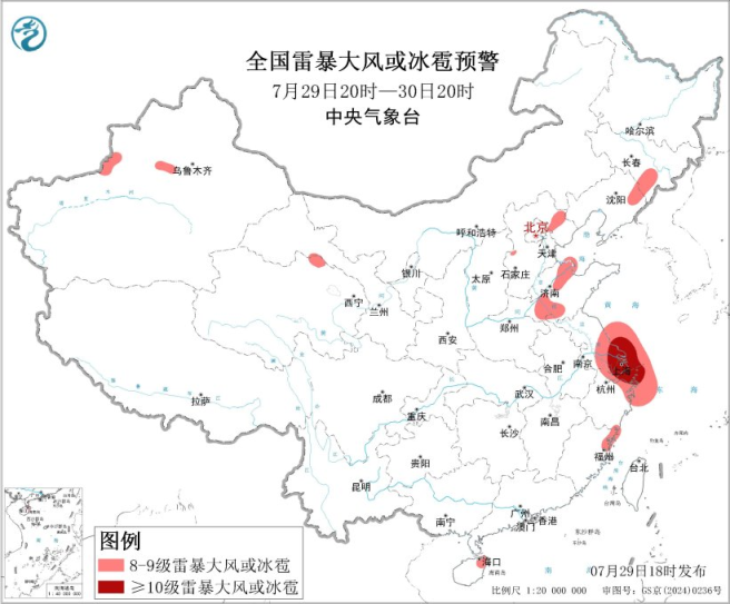预计7月29日20时至30日20时,东北地区东部、黄淮北部、江淮东南部、江南东北部等地的部分地区将有8级以上雷暴大风或冰雹天气,其中,江苏中南部、上海、浙江北部等地的部分地区将有10级以上雷暴大风,最大风力可达11级以上;东北地区东部、黄淮北部、江淮南部、江南东北部和中部、华南等地的部分地区将有小时雨量大于20毫米的短时强降水天气,其中,吉林东部、辽宁东部、江苏中南部、上海、浙江北部、广东南部沿海和中南部等地的部分地区小时雨量大于50毫米,最大可达70毫米以上。