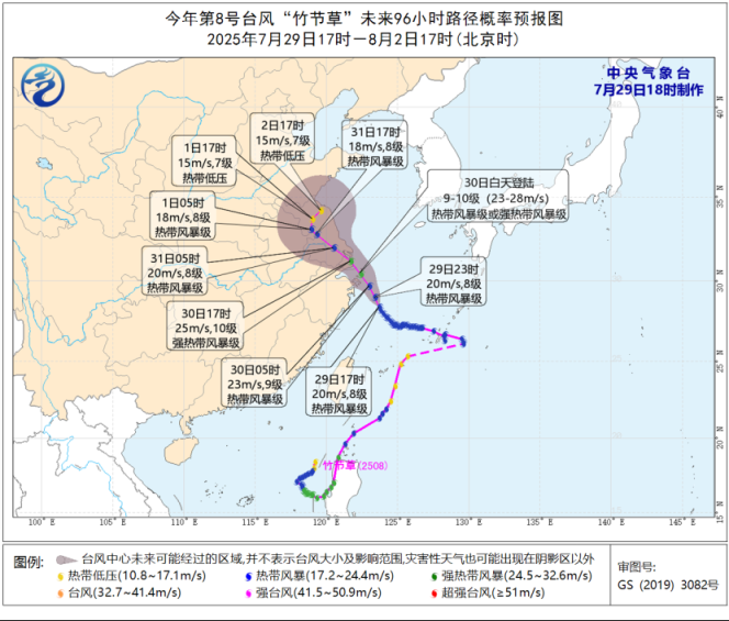 预计,7月29日08时至30日08时,内蒙古西部和东北部、新疆东部和南疆盆地、青海北部和西部、甘肃河西、上海、浙江北部、江苏中南部等地有5~6级、阵风7级的大风,其中,上海、浙江北部、江苏中南部等地部分地区有7~8级、阵风9~10级的大风;黄海南部海域、东海大部海域、台湾以东洋面、巴士海峡将有7~8级、阵风9~10级的大风,其中台风“竹节草”中心经过的附近海域风力可达9~10级、阵风11~12级,南海大部海域将有7级、阵风8级的西南风。