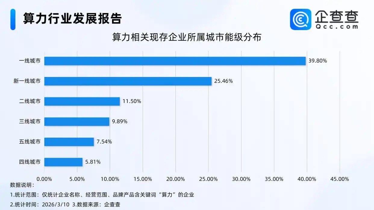 算力相关企业的地域分布与城市能级高度关联,呈现出向高能级城市集聚的显著特征。企查查数据显示,国内现存算力相关企业中,一线城市相关企业数量占比遥遥领先,达到39.80%,成为算力产业发展的核心集聚地;新一线城市紧随其后,占比为25.46%。二者合计占比超65%,充分体现出高能级城市在人才、技术、资源、市场等方面的优势,对算力产业形成了强大的吸引力。